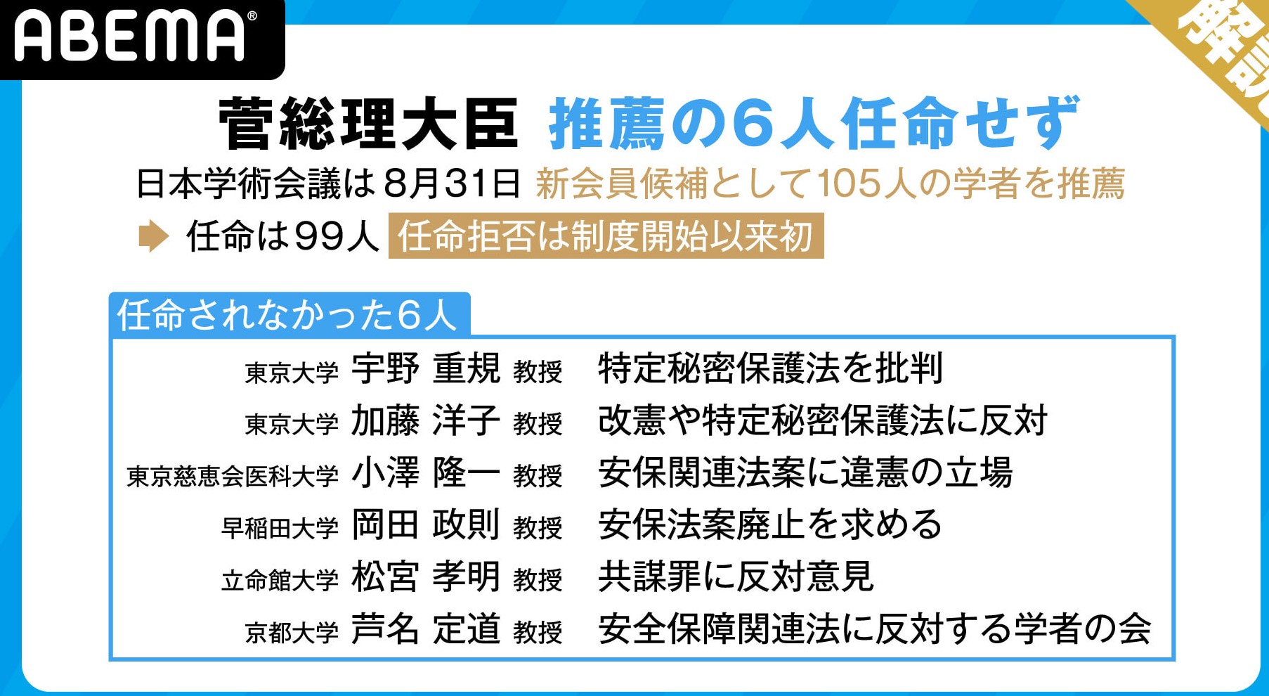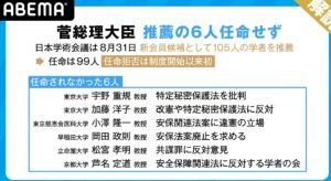 日本学術会議に任命されなかった6人。いずれも「安保法制反対」「特定機密法案反対」と、日本にの安全保障にとって重要な法案に反対していた。国益に反する活動をしていた学者。 ある人の解説では、「国際的には、学者としては、二流」だそうです。・・・すごく納得しました。 おまけに、任命されなかった松宮孝明さん、恨みに思ってか「任命しないと、内閣が倒れるよ・・・」と恫喝する始末。 人間性も良くない。 「任命されなくて良かった」と思いました。