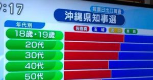但し、若者世代は、佐喜眞候補への投票が多く、高齢者が玉城デニーに投票するという傾向がみられる。ここに、僅かな希望がある。