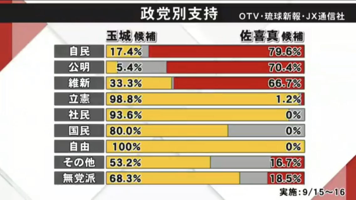 で・・・政党別にみると、自民党、公明党、維新の会は佐喜眞候補にほぼ投票している。問題は無党派層。この層がかなり玉城デニーに投票している。